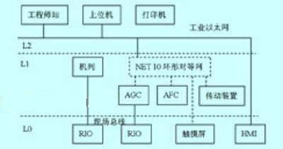 圖1是某有色金屬加工廠設計改造的一臺銅冷軋機的控制系統結構圖。該系統采用了三層網絡控制方案,最底層為現場設備級網絡,中間為環形對等網絡,最上面是工業以太網。